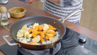 锅里加少量油,洋葱翻炒出香味后,土豆胡萝卜下锅;