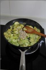 待角瓜片炒软,放入干贝炒匀,调入盐翻炒均匀