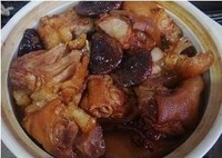 Tip:1.猪蹄买好时让摊主帮忙剁好,回来后仔细去除了没处理干净的毛就好,一定要选蹄筋都还在的猪蹄才好吃,发现有些超市里卖的猪蹄都是去除蹄筋的,虽然价格稍便宜些但是口感就没那么好吃了。 2.冷水下锅氽烫猪蹄可以将血沫杂质更好的去除,猪蹄腥气重氽水也能很好的去腥气。 3.一定要选用干香菇一起炖这样炖煮的时间久些才会更好吃, 4.泡发香菇干的水不要倒掉,放入锅内一起煮让香味更浓郁 5.滴入少许食醋让猪蹄可以加快炖烂的速度 6.反复加水因为砂锅容量不够大,不能一次加足水,猪蹄炖烂时多余些汤汁可以用来泡饭