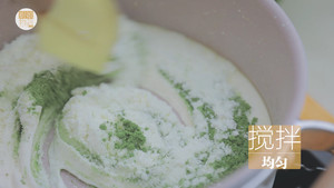 关火加入17g奶粉、3g抹茶粉搅拌均匀。