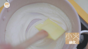 [紫薯麦片雪花酥] 这款紫薯味和麦片最搭了,特别适合老人和孩子哦:锅内小火融化20g黄油,加入75g棉花糖搅拌至融化。