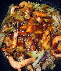 放入黄油、放姜和蒜炒香,放入蔬菜炒半熟,把肉、虾、鸡翅扑在上面,加入一点水,抹上老干妈,盖上锅盖焖15分钟,