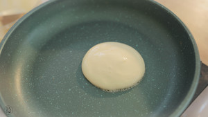 平底锅开小火,倒入一勺面糊。面糊内部组织结构在温度升高后,会呈现出蓬松细密的组织,香气也出来了。尽量不要倒多,以免太厚不容易熟。