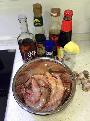 将大虾放入稍大容器腌制,依次放入配料中的料酒、生抽、老抽、蚝油、糖;