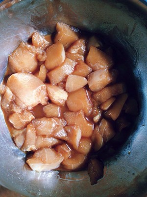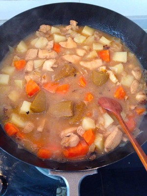 切记!切记,一定关火后加咖喱块,要不容易糊底。放入咖喱块就搅拌,全部融化后再开火,放一勺花生酱,小火5分钟。