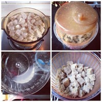 锅里坐水烧滚,把洗去盐分的烤麸倒进去煮两分钟捞出甩干水分。这么复杂的处理主要是为了去掉发酵味道,煮两分钟正好,时间长了烤麸就煮烂了。最后水分一定要甩干,因为接下来要过油炸。(我用的蔬菜甩干器)