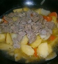 至土豆边缘微透明,放入牛肉和炖肉的汤,至没过牛肉一指为好,大火烧开转中火将土豆炖熟