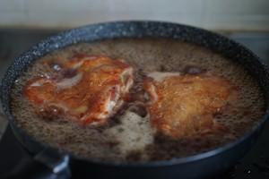 加水或高汤,没过鸡腿就可以,把葱段、蒜瓣拍碎、姜片扔进去炖煮,这一步你可以尝尝味道,看看颜色,酌情再添盐啊、老抽啊、蜂蜜啊什么之类的。中火烧开一会儿,不用给鸡腿翻面会破皮就不好看了。因为鸡腿已经煎熟,所以不需要长时间炖煮,这个过程也就20来分钟左右,期间用勺子舀汤汁浇到鸡皮上有助于上色,当然你可以不这么做,只是颜值上会差一些而已。汤汁渐渐变少,少到只剩差不多一小碗的时候把鸡腿捞出来,放到别的地方,把水淀粉加到锅里剩下的汤汁里面,一点点加,知直到满意的浓稠度为止。鸡腿切片,浇酱汁儿撒白芝麻,趁热食用