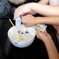 倒入两盒儿童牛奶,并搅拌均匀。