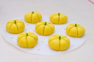 这里重点说一下:我是直接在油纸上操作的,这样全部做好直接把油纸和南瓜一起放入蒸锅上蒸就好,这样南瓜不会变形;如果没有油纸,那就蒸层刷层油,做好的南瓜两手轻轻的一个个排放入蒸锅里,再用手整下型,捏圆,牙签痕迹不明显的话在轻压一些
