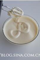 几个小时后,将鲜奶油+细砂糖打发,涂抹在蛋糕上方~