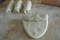 包子收口朝下,用擀面棍擀一擀。卷起,按顺序晾在一边。 【重复卷两遍】可以让酥层更多。