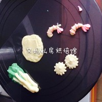 摆上冷冻好的奶油霜青菜,鱼板,虾仁和蛋白,在蛋白上用黄色果胶挤出蛋黄,最后用绿色的奶油霜装饰店葱花。碗面蛋糕就完成啦。