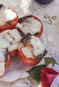 烤好的鳗鱼铺在盛好米饭的番茄上。