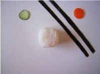 将少许的白米饭捏成实诚的团儿,用手指在中间戳一个洞。