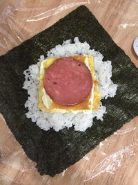 米饭加入寿司醋拌匀,没有寿司醋的可以把白醋和糖1:2的比例调和成代替寿司醋,把拌好的米饭平铺在紫菜上(紫菜下铺一层保鲜膜,便于一会包饭团)。