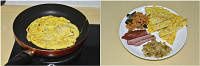 先将米饭煮熟,鸡蛋加少许盐打散后,平底锅放少许油将蛋液倒入煎成蛋饼。 蛋饼,香肠切条状,准备好其他配料。