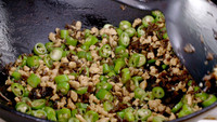 炒到收汁后,放芽菜碎,翻炒出香,再下小青椒炒匀;