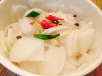加糖,份量看你喜好,不能太多哦,不然喧宾夺主了,腌渍半个小时,还会有水出来,没关系,让它尽情出小半小时后把水倒掉。这个时候拿一片出来试试咸淡,淡了加盐,咸了用饮用水清洗一洗