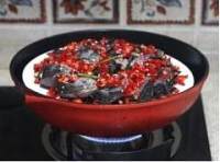 再把鱼头剖开,不切断,和芽菜一块儿炒1分钟左右