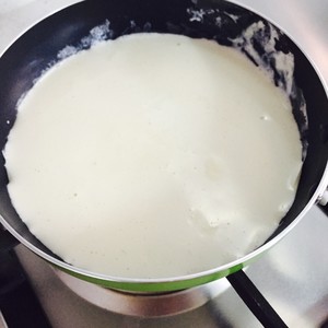 搅拌均匀的牛奶蛋糊再重新倒回锅中,小火加热,不断搅拌至糊状,一看到沸腾就马上离火。离火后可以继续搅拌,至均匀的糊状。倒入容器中,冷却后待用。