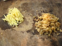 下米,因为我放的水比较多,所以就没盖盖了,如果盖盖的话,水一开就会溢出来了。可以用长柄木勺不时地搅拌一下,记得要一个方向搅拌哦。这会还是大火。一直等到米煮开花了,不时地搅拌一下,放油、冬菜、姜丝,尝一下味道,不够的话还可以加点盐。我是加了一点盐的。