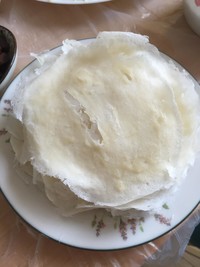 抓住一坨,在手中找一下感觉,流下去,手一提就能弹回来说明面团合适。用平底锅小火加热,锅里什么都不加,不放油。拿着手的面团在锅里一转提起来一个皮子就好了,等表面厚的部分颜色变了它就会慢慢翘起来,皮就好了,多试几次就能找到感觉了,火不能大。我也是第一次做,都很顺利,第一个皮就成功了