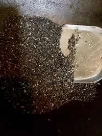 将黑芝麻放在锅中小火不停的翻炒,以免焦糊,炒至黑芝麻开始跳动的时候,听到爆声盛出放凉。