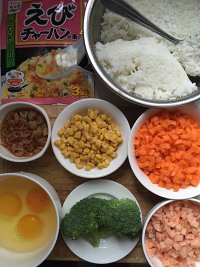 材料准备: 1)鲜贝、开洋隔夜用料酒泡软,料酒有除腥作用 2)玉米、青豆、胡萝卜(切丁)提前蒸熟 3)现做米饭,或者隔夜饭微波炉叮热 4)三文鱼切丁,用料酒去腥(如不介意少量腥味,可以不去,其实黑胡椒也可去腥味) 5)西兰花汆水