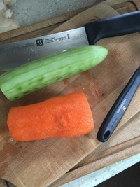 黄瓜胡萝卜去皮切丝,我用的擦丝器,蒜头用压蒜器压成蒜泥,香菜洗净切断。