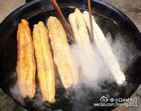 两条合在一起用筷子压一下,下油锅翻炸。不要用有香味的油(如花生油),中火炸到自己喜欢的硬度关火。