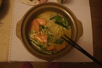 将烧开的鸡汤装入砂锅,放入步骤二中材料,加入米线,加盖焖一阵。