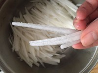 加油炒香开洋、鲜贝后,加入萝卜丝炒软,放盐、黑胡椒(或白胡椒)调味,调味后需要略咸,因为澄粉粘米粉酱会稀淡。