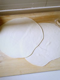 面和水适量和好(硬些),醒10分钟后,分成几块,杆成薄片。