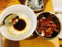半小时过去了,掀开锅盖看一下(电源依旧开着),应该是水几乎快干的程度,搅拌,把肉脯在米饭上铺周围一圈(中间给鸡蛋留个洞),把调料汁淋在肉脯上淋一圈(喜欢的可以擦点姜末上去,我没有就略了);把蛋打到中间盖盖继续炖~
