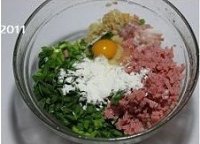 韭菜洗干净切碎,五花肉切碎,火腿切碎,鲜贝泡开切碎,全部混在一个碗里,嗑入鸡蛋,加入米粉,调入胡椒粉,盐,糖,油,拌均匀