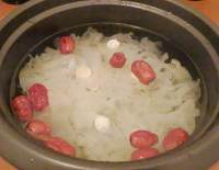把之前做好的银耳和莲子红枣放进电饭煲中,并加入适量水。(要没过银耳)