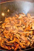 调入蚝油、草菇老抽、糖和盐后大火翻炒,注入没过食材约2指的沸水,调中小火熬煮15分钟,至汤味香浓
