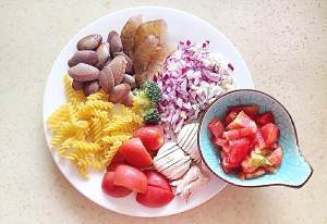 准备好基圍蝦、花甲、西紅柿、白蘑菇、洋蔥、西蘭花
