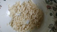 空档开始制作面疙瘩,取一个尽量大的碗,倒入面粉,取一只空碗,倒适量水。左手沾湿,往面粉里甩水,右手迅速搅拌面粉至水滴消失,左手继续不断往面粉里面甩水,并且不断用右手快速搅拌。直到面粉被搅拌至小小颗粒的面疙瘩。
