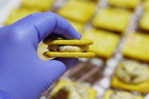 如果你们买的苏打饼干也有正反面 ?那么请将光滑的反面朝上摆 更有利于夹牛轧糖和美观