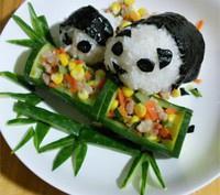 盛出孩子平时的饭量,捏成团,用紫菜条包在中间做成熊猫身,再用紫菜剪出耳朵,眼睛和鼻子嘴巴。贴到饭团上做出熊猫。用饭团半压着竹筒,摆出熊猫也在吃饭。^-^