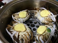 螃蟹上蒸锅,每个螃蟹肚子上放一片姜
