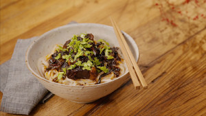 面煮好,浇上牛腩块、汤汁,再撒上香菜就可以吃了。张大千喜吃善做的这碗红烧牛肉面下肚,饱腹又过瘾;