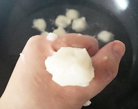 烧水,不用沸腾,小火保温,把手沾湿,舀一汤匙放手心里,虎口挤出一个个小丸子放入水里成型;