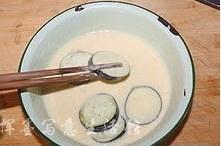 用筷子逐个将沾满面糊的茄子片放入撒了油的平底锅中