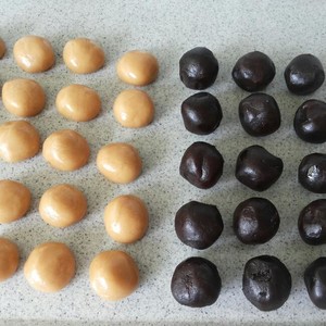 1.将糖浆、植物油、枧水放入容器,充分拌匀后筛入低筋粉,搅拌均匀,捏成面团,盖上保鲜膜醒一小时以上。2.豆沙馅和醒好的饼皮面团分别切割称重,搓圆备用。