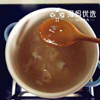 再次煮沸后倒入第一步的藕粉浆,边倒入边搅拌,直至汤羹变浓稠半透明状