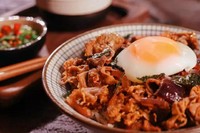 将煮好的蛋置于肥牛饭上,撒点海苔碎。