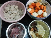 红萝卜洗干净切好,菜干泡发切段,陈皮泡一下,无花果,罗汉果,南北杏百合用水洗一下(以上备用)